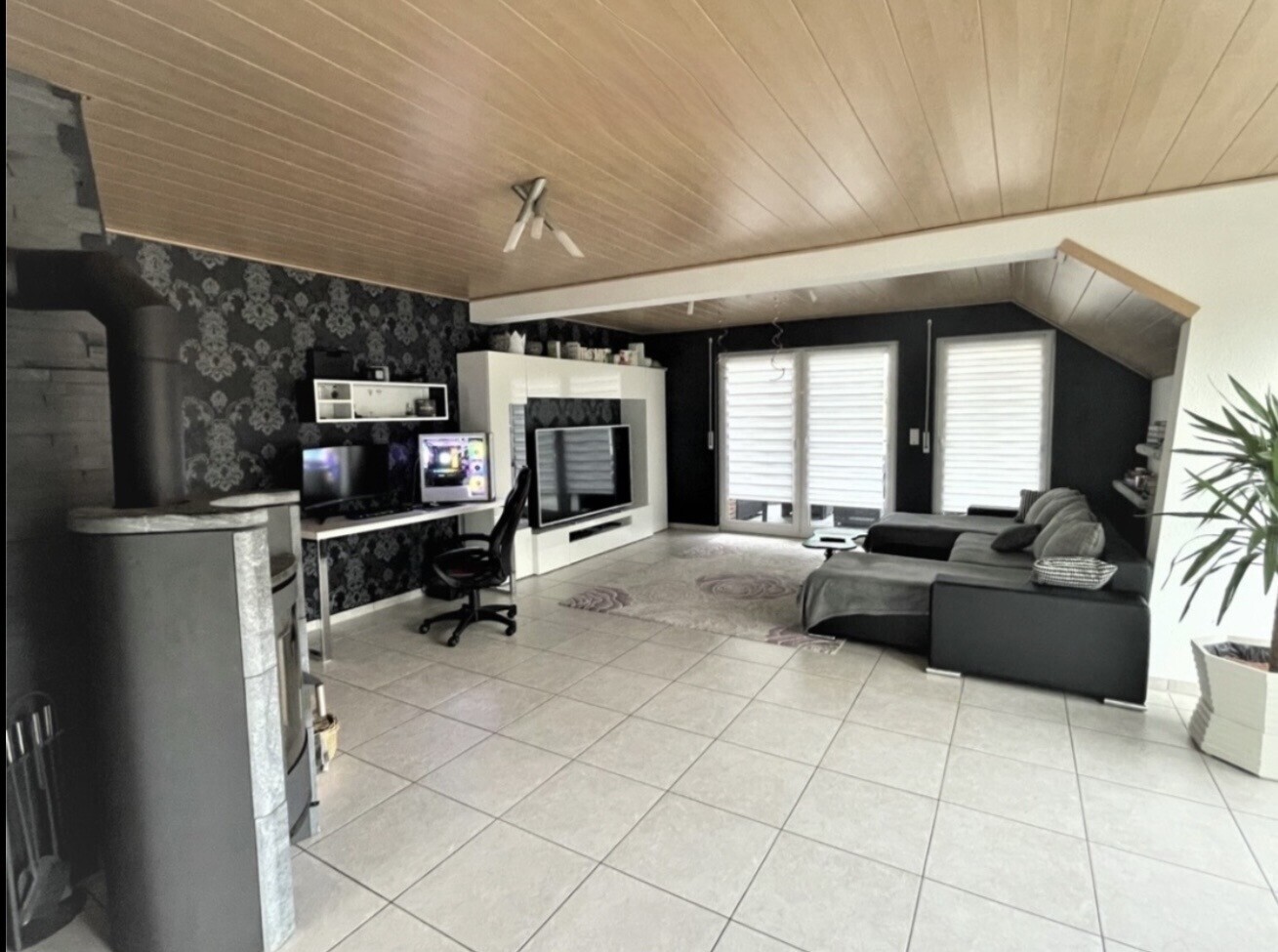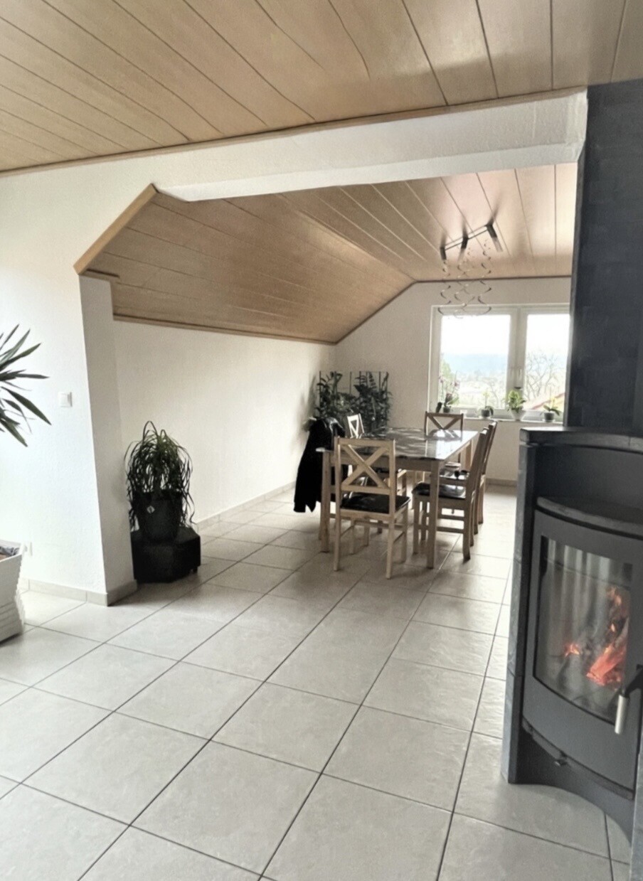 Die danebenliegende Wohnung Nr. 2 mit ca. 106 m² bietet eine Küche mit Abstellraum, ein Esszimmer, ein Wohnzimmer und ein Schlafzimmer, ein Arbeitszimmer sowie ein Bad, ein separates WC und eine Diele. Zusätzlich verfügt diese Wohnung über einen Kaminofen und einen Balkon.